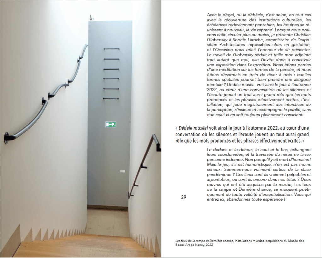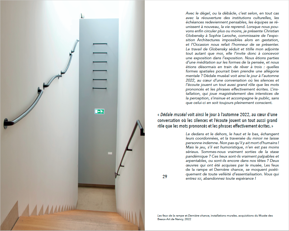 Un livre et un catalogue donc, autour d’une exposition « carte blanche » réalisée au Musée des Beaux-Arts de Nancy à l’automne 2022 / hiver 2023, intitulée « Dédale muséal ». Huit installations disséminées dans le musée, trois acquisitions dont deux accrochés de manière permanentes dans le musée. Avec une large introduction de Susana Gallego-Cuesta, directrice du Musée, et un texte d’auteur, Anatomie du sourire, justement :