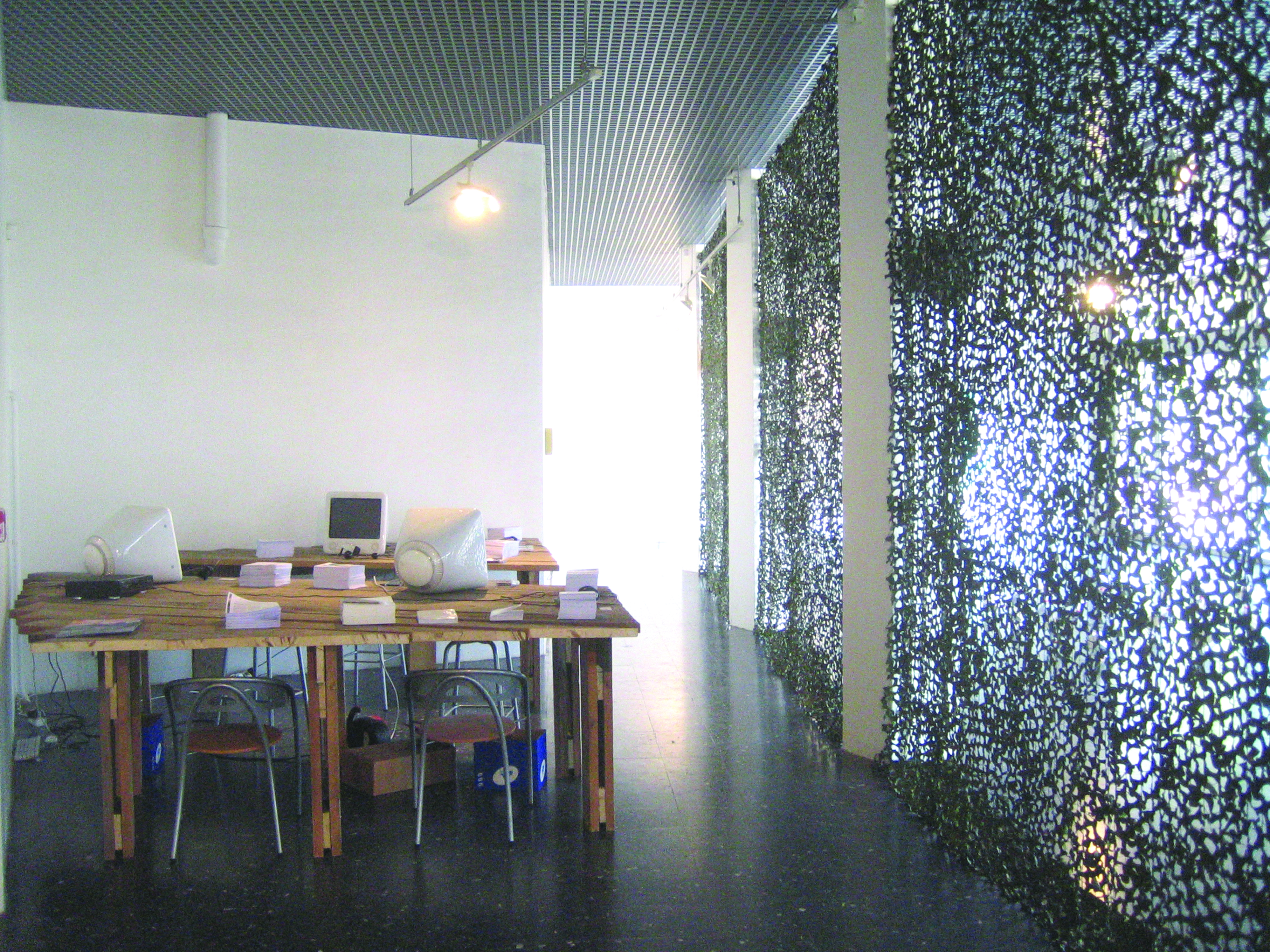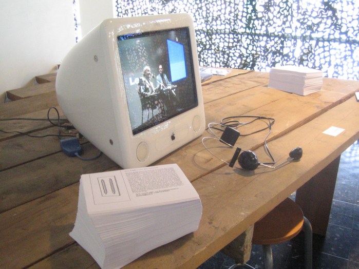 La vidéo est visible sur un écran moniteur. Un casque permet d’écouter mais aussi de réagir par la voix grâce au micro intégré. Les interventions vocales du spectateur font apparaître des phrases générées par ordinateur et animées en surimpression et de façon fugitive. L’installation vidéo interactive prenait place dans Le centre de documentation, grande table conçue et fabriquée pour l’exposition, où se trouvait site internet, installation vidéo interactive, CD audio, livres, revues, tracts.