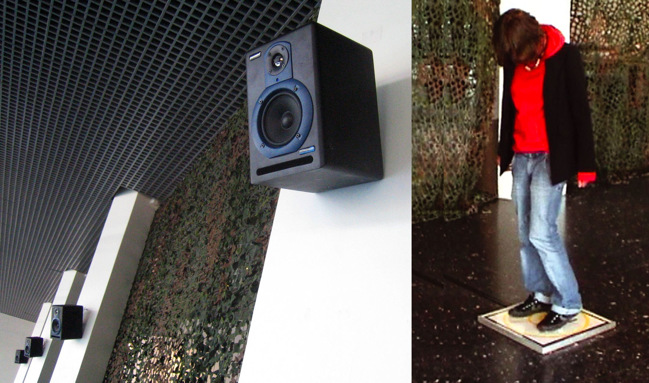 Le spectateur, debout sur une plaque sensible, interagit avec le son par de légers déplacements du corps. Les mouvements déclenchent des processus sonores et répartissent les sons diffusés par huit enceintes acoustiques à travers l’espace