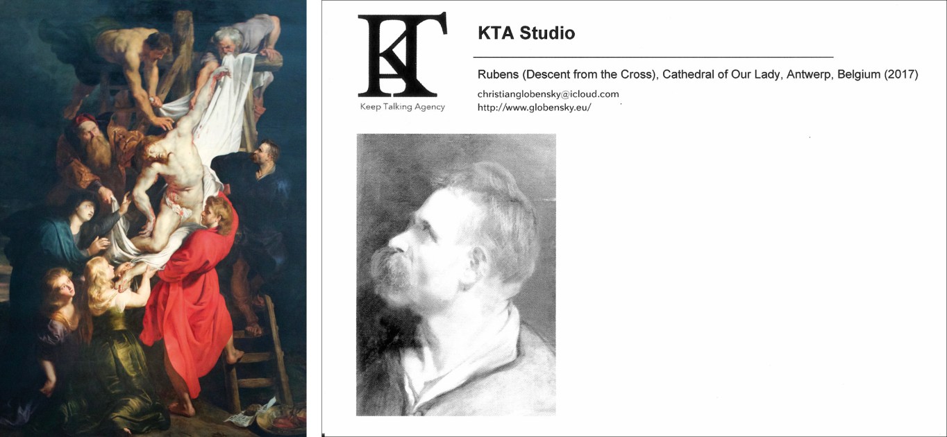 Rubens (Nietzsche carrying Christ on his descent from the cross), Cathedral or Our Lady, Belgium. Carte postale duo, 10x15cm, KTA Studio, 2017.