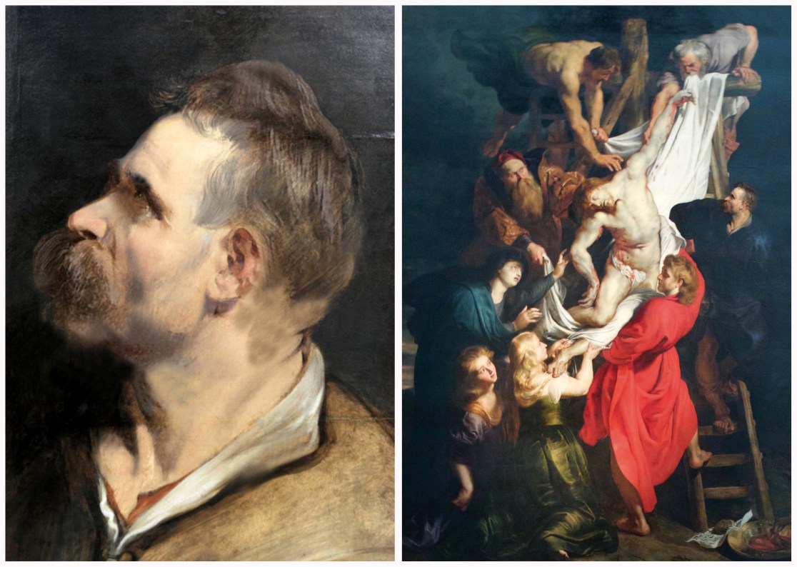 En faisant quelques recherches, j’ai découvert que cette « étude » avait été réalisée en vue de la préparation d’un triptyque, « La décente de la croix » (1616-1617), aujourd’hui à la Cathédrale Notre-Dame d’Anvers. L’image est trop belle pour être vraie : Nietzsche portant le Christ à sa descente de la croix. On y entend les échos assourdissants du Ecce homo de Nietzsche : « Dionysos contre le crucifié », ou encore, « Bouddha contre le crucifié », mais entendu ici non pas comme une confrontation surexcitée, mais comme un méticuleux réajustement des tentions verticales jusqu’ici codées par la religion et la métaphysique.