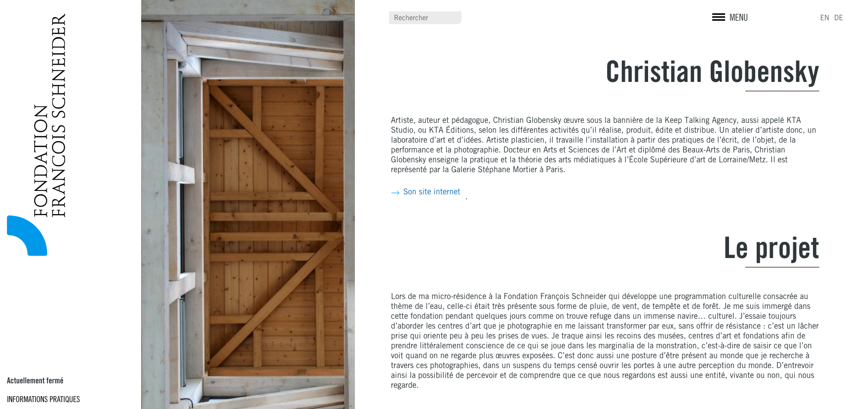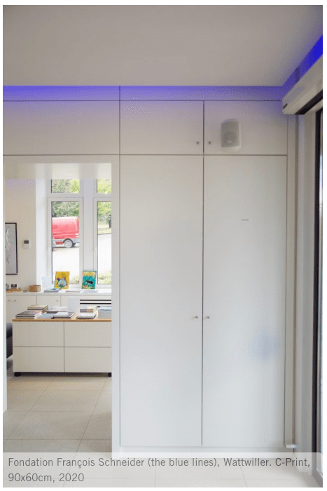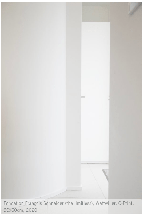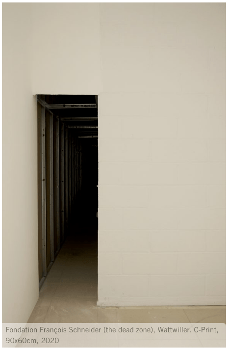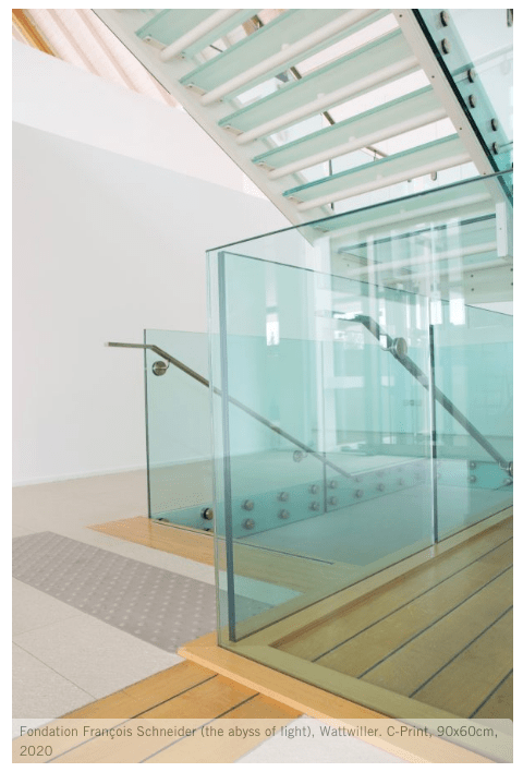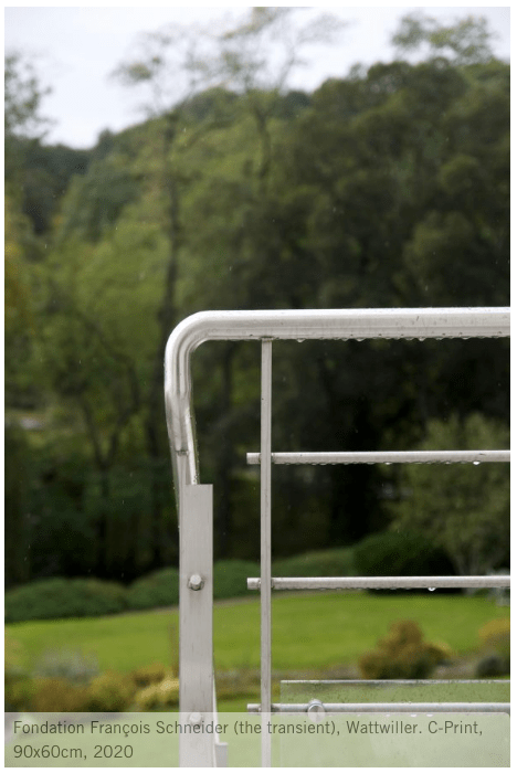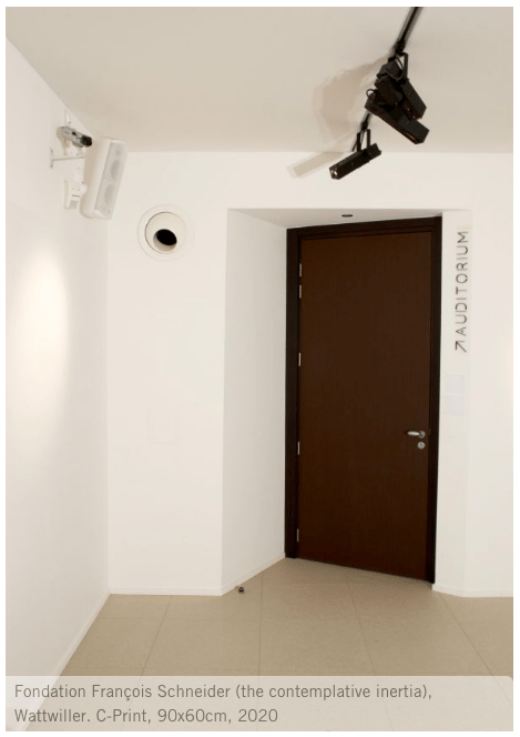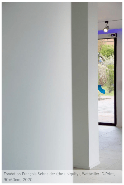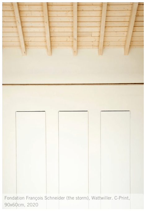 «Lors de ma micro-résidence à la Fondation François Schneider qui développe une programmation culturelle consacrée au thème de l’eau, celle-ci était très présente sous forme de pluie, de vent, de tempête et de forêt. Je me suis immergé dans cette fondation pendant quelques jours comme on trouve refuge dans un immense navire… culturel. J’essaie toujours d’aborder les centres d’art que je photographie en me laissant transformer par eux, sans offrir de résistance : c’est un lâcher prise qui oriente peu à peu les prises de vues. Je traque ainsi les recoins des musées, centres d’art et fondations afin de prendre littéralement conscience de ce qui se joue dans les marginalia de la monstration, c’est-à-dire de saisir ce que l’on voit quand on ne regarde plus œuvres exposées. C’est donc aussi une posture d’être présent au monde que je recherche à travers ces photographies, dans un suspens du temps censé ouvrir les portes à une autre perception du monde. D’entrevoir ainsi la possibilité de percevoir et de comprendre que ce que nous regardons est aussi une entité, vivante ou non, qui nous regarde.»