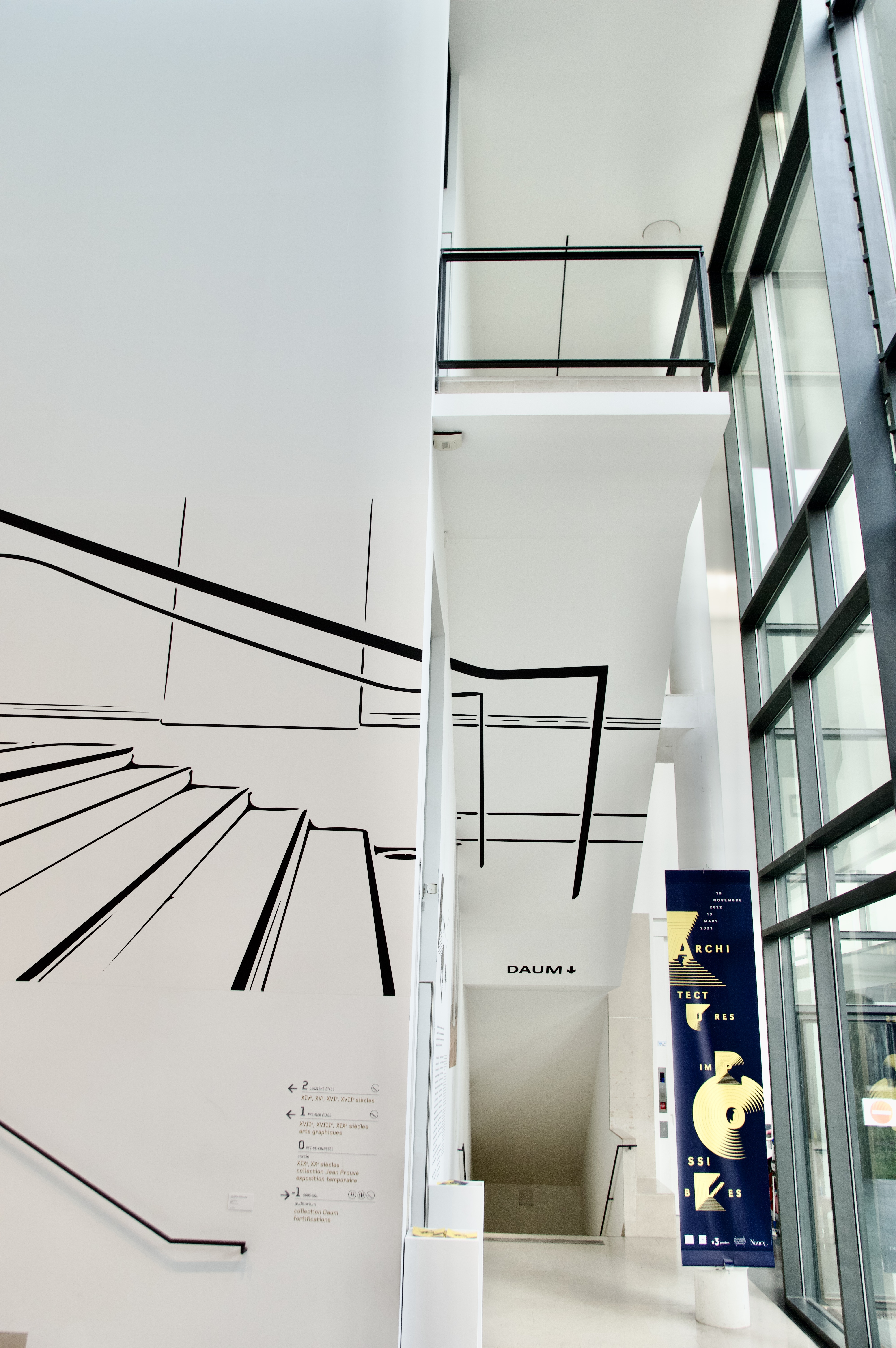 Redescendant par le grand escalier en fer à cheval, longeant le mur vitré donnant sur cours, on aperçoit au loin Déjà-vu, l’escalier des escaliers.