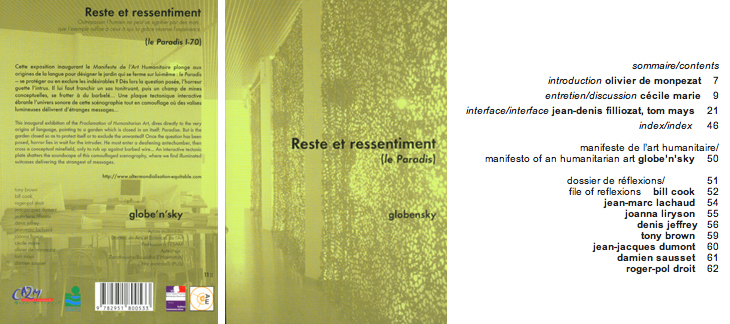 Le catalogue de l’exposition « Reste et ressentiment (le Paradis) », de 2006 à la Galerie de l’Esplanade, à Metz, de Christian Globensky. Textes de Cécile Marie, Roger-Pol Droit, Denis Jeffrey, Jean-Jacques Dumont, Damien Sausset, Tony Brown, Bill Cook, Jean-Denis Filliozat, Jean-Marc Lachaud, Olivier de Monpezat, Tom Mays. Design graphique : Christian Globensky.